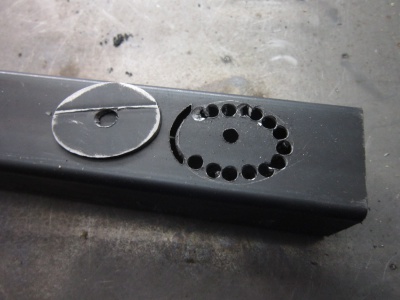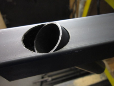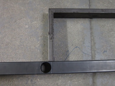 - Im rechten Winkel trifft hinten die Strebe auch das lange Steuerohr. (Das 20er Quadratrohr wird bis zur Hälfte vom Steuerrohr geschnitten). Das Steuerrohr wird in das ø33mm Durchgangsloch gesteckt, das auf dem Bild links zu sehen ist.