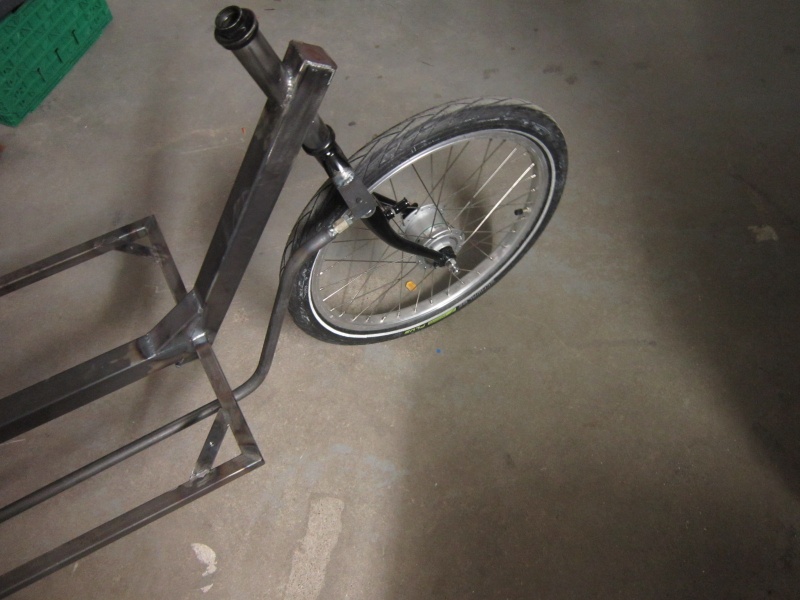 Das lange Steuerrohr ist ungewöhnlich lang, man bekommt so ein Teil nicht in jedem Laden. Daher wird es selbst gebaut, und zwar aus einem zerteilten Schaft einer Fahrradgabel. Dazwischen kommt ein Rohr was genau in den Schaft passt.