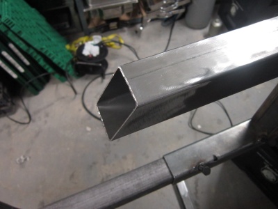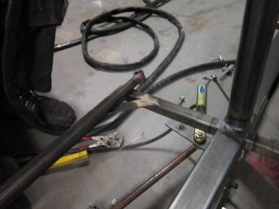 - Vorne trifft die Strebe im rechten Winkel genau an den schrägen Schnitt. Es liegt an der Schnittkante, aber außerhalb des Unterrohrs und trifft auf das später schräg angeschweißte 40er Quadratrohr, auf den Knick.