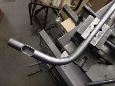 Unten sind Fotos, welche die Verbindung mit dem bearbeiteten Stahlrahmen mit dem langen hinteren Steuerrohr zeigen. Hier wurde die Form durch Feilen erstellt, wofür man viel Gelduld braucht. Mit einer großen Ständerbohrmaschine mit langem Pinolenhub, oder mit einem "Tubenotcher" kann man diese Bohrung auch mit einer Lochsäge machen. Da die Wände der Rohre nicht dick sind, kann man auch sehr vorsichtig flexen und feilen und immerwieder überprüfen bis alles zusammenpasst. Je genauer die Anpaßung, desto einfacher wird das Schweißen nachher.