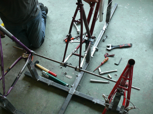 Diese stabile „Transporteinheit“ ist bei allen Modellen ein Normbauteil und bis auf die Spezifika der Rahmen-Verbindungsstücke immer gleich. Neben einem gut erhaltenen Rahmen als Grundlage (bei a. und b.) wird neben einzelnen Bauteilen wie Bremsen, Lichtanlage oder Tretlager, das komplette Gestänge mehrerer Räder wiederverwendet. Die Stahlrohre werden auseinander geflext und nach einer Schablone neu verschweißt. Detlef baut hierfür eine Vorrichtung, die auch Laien den zügigen und einfachen Zuschnitt der benötigten Teile ermöglicht. Beim ersten Workshop wird der Hecklader gebaut, beim zweiten Workshop der Frontlader (wobei Teilnehmer wählen können, ob sie Heck- oder Frontlader bauen wollen), evtl. wird der Anhänger-Prototyp zwischendrin fertiggestellt, ggf. auch erst zum dritten Workshop im November.