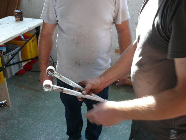Auftrennen des Tretlagers. Die zwei Teile drehen und wieder neu verschweißen.