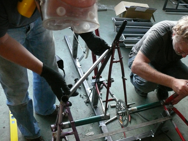 Montage der zugeschnittenen Rahmen-"Dreiecke" auf der "Bike-Bench"/Rahmenlehre.